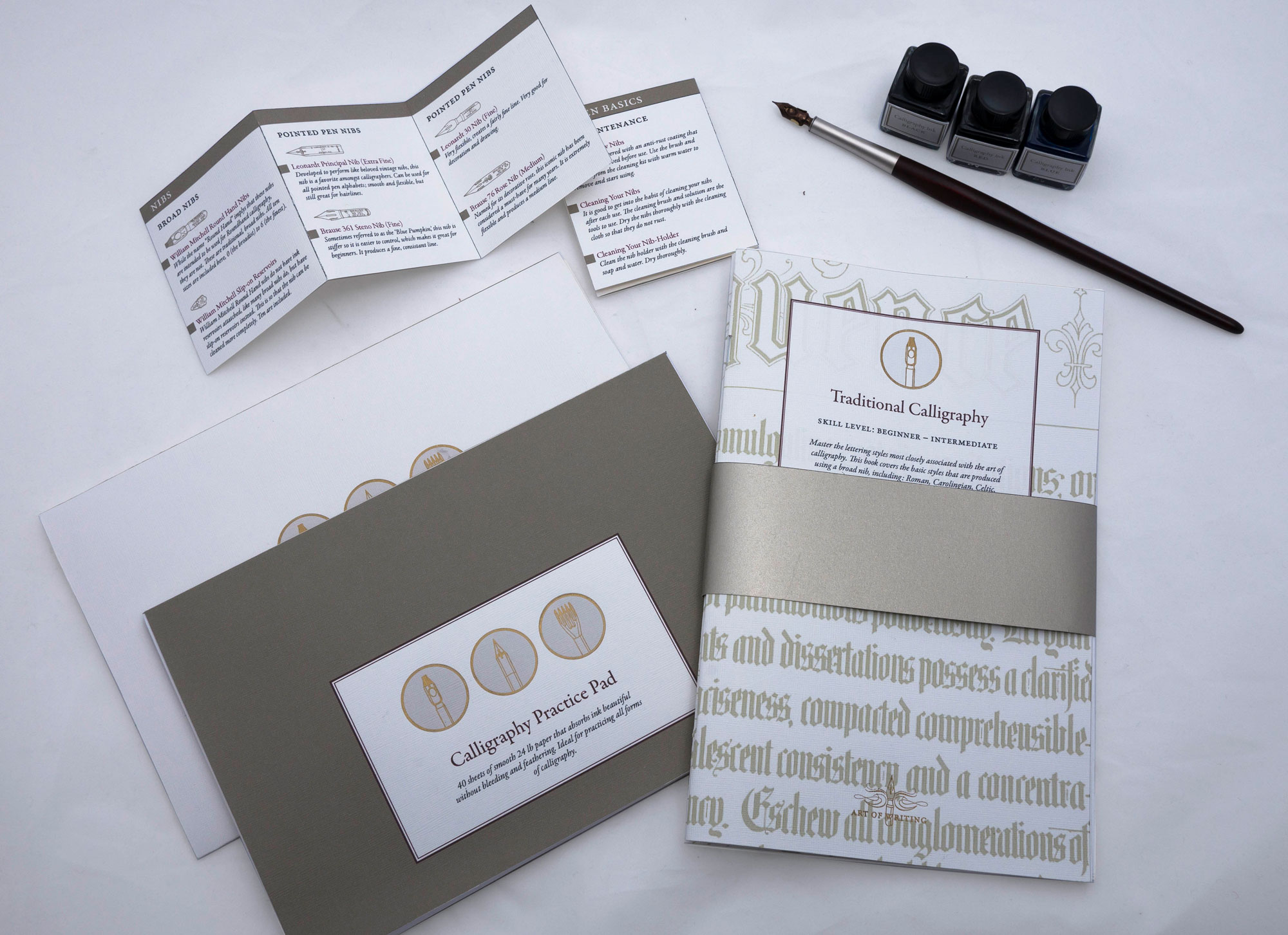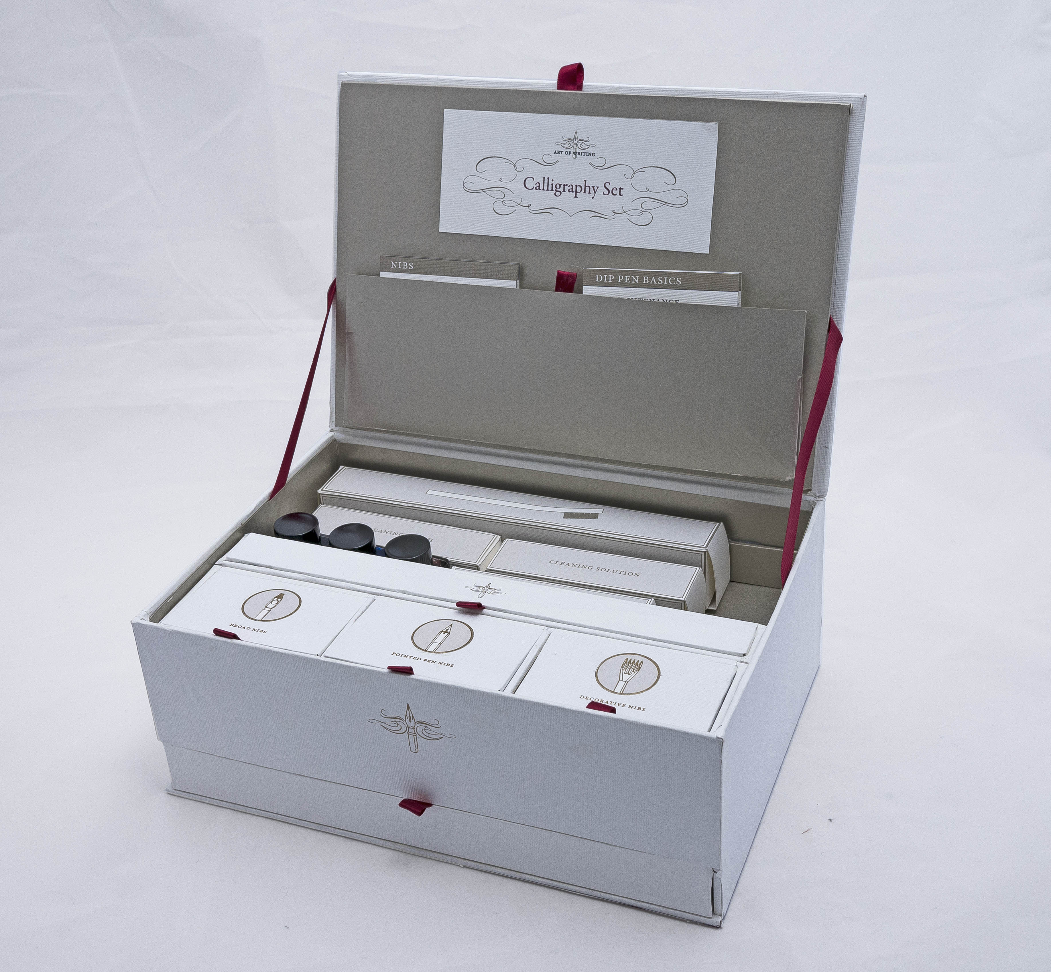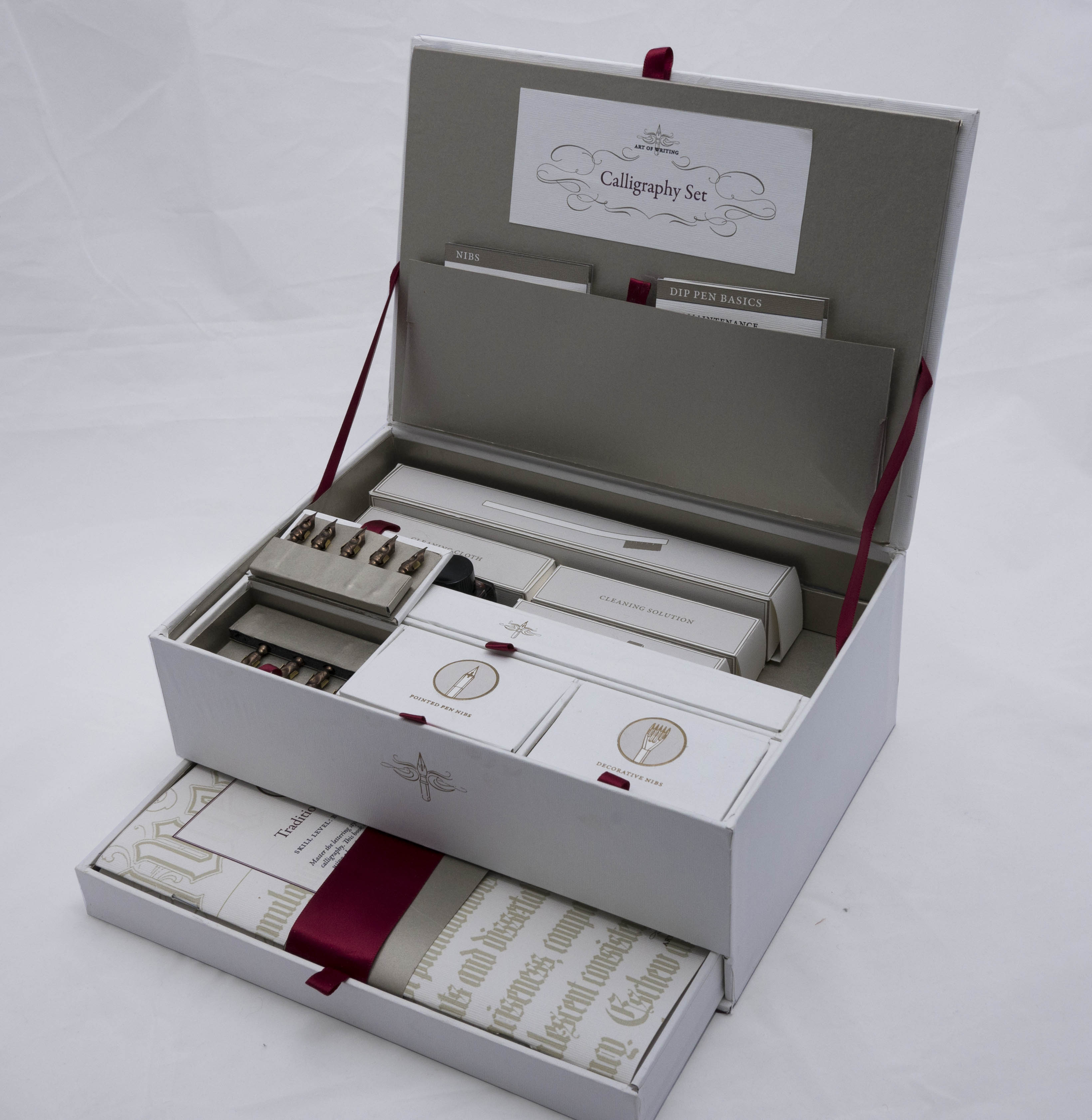 Packaging design for a calligraphy set that includes all supplies needed to grow from a beginner to a more advanced calligrapher. The elegant, sophisticated design makes the set appeal to calligraphers with a range of skill-level, and the quality tools ensure that the set is able to suit an advanced user as well as a beginner.