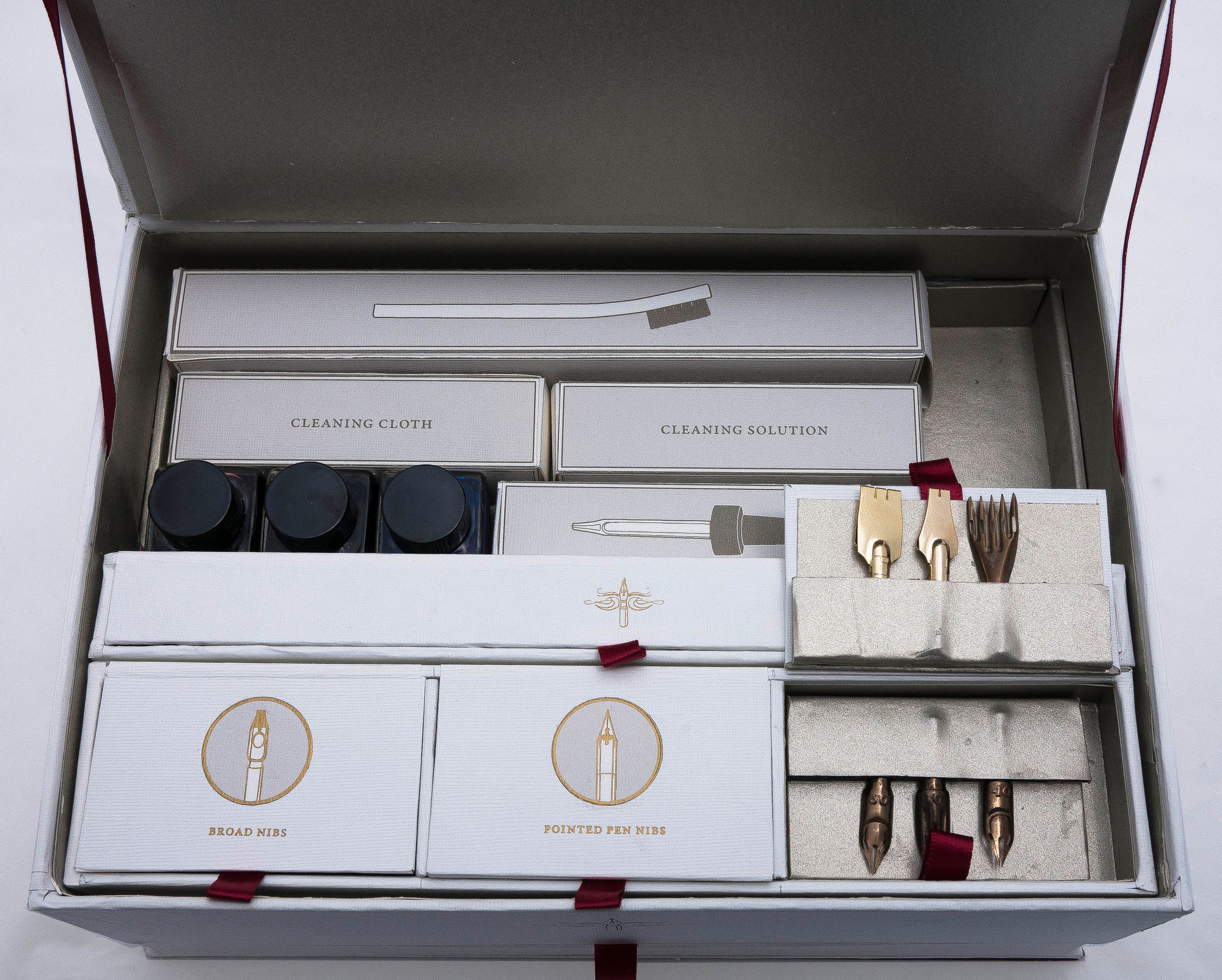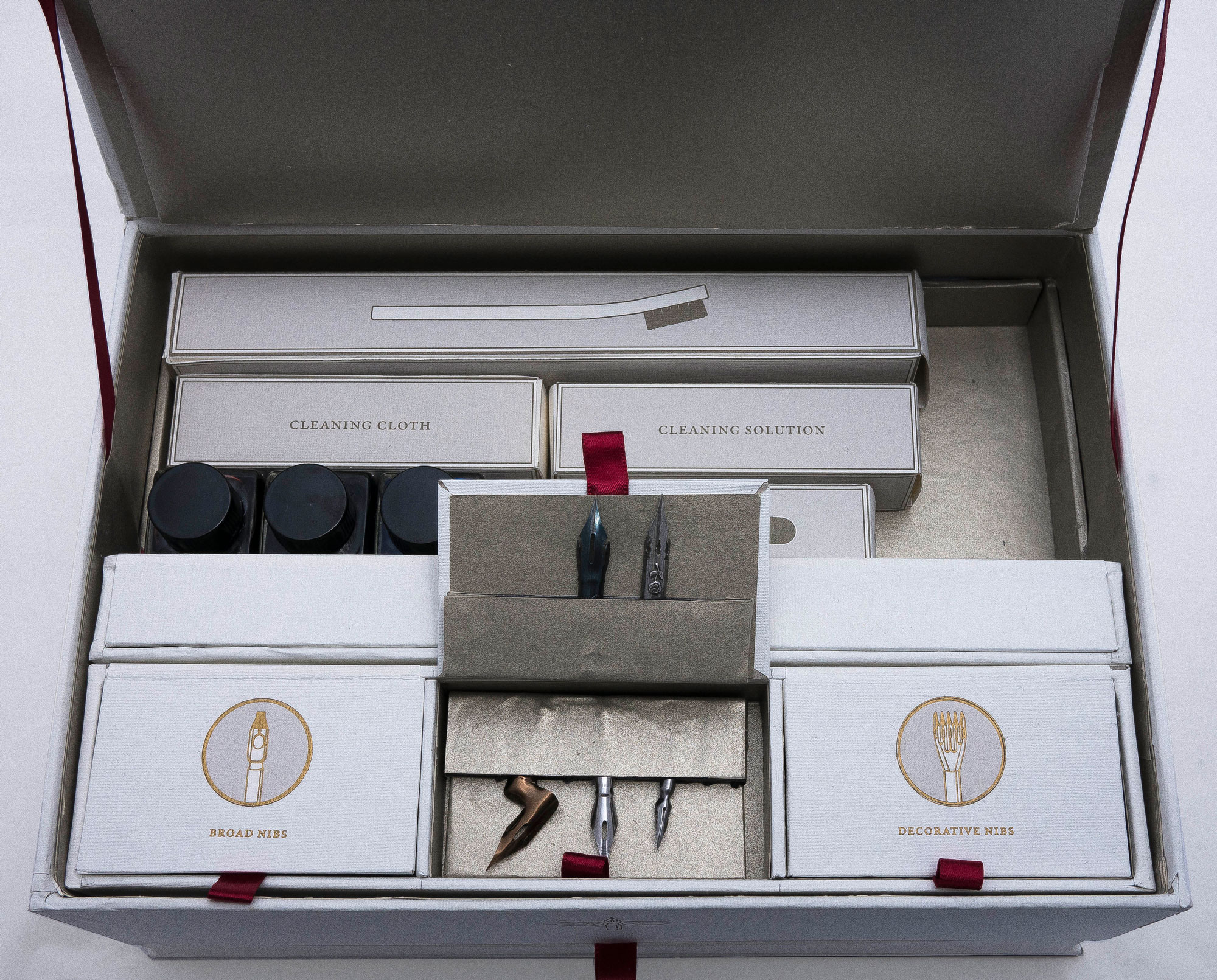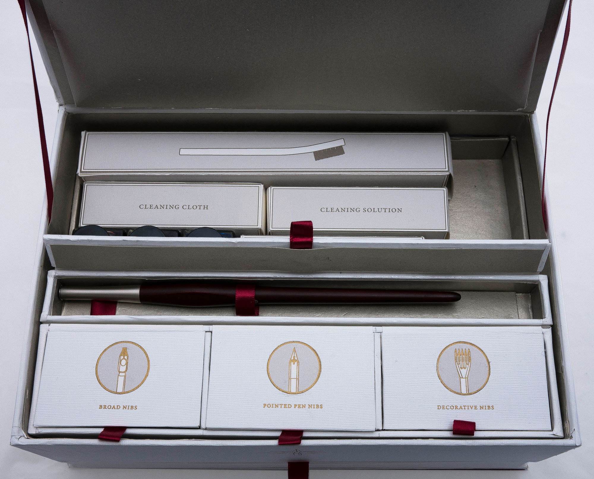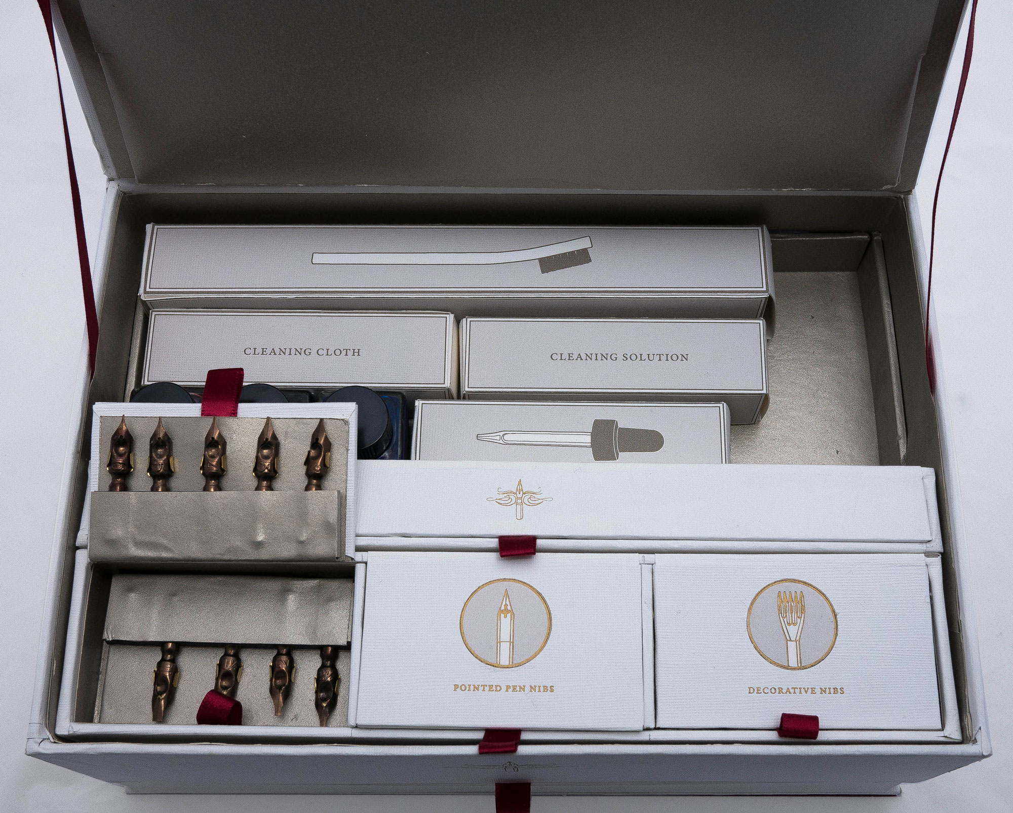 Packaging design for a calligraphy set that includes all supplies needed to grow from a beginner to a more advanced calligrapher. The elegant, sophisticated design makes the set appeal to calligraphers with a range of skill-level, and the quality tools ensure that the set is able to suit an advanced user as well as a beginner.