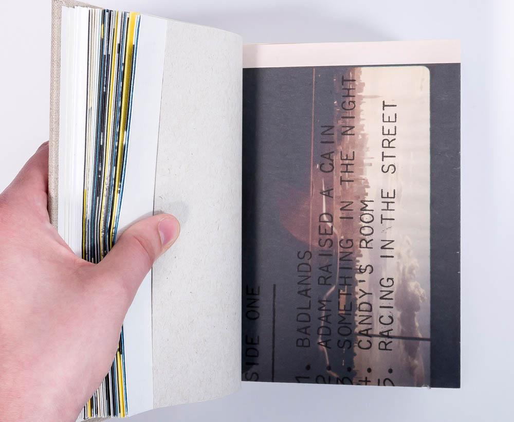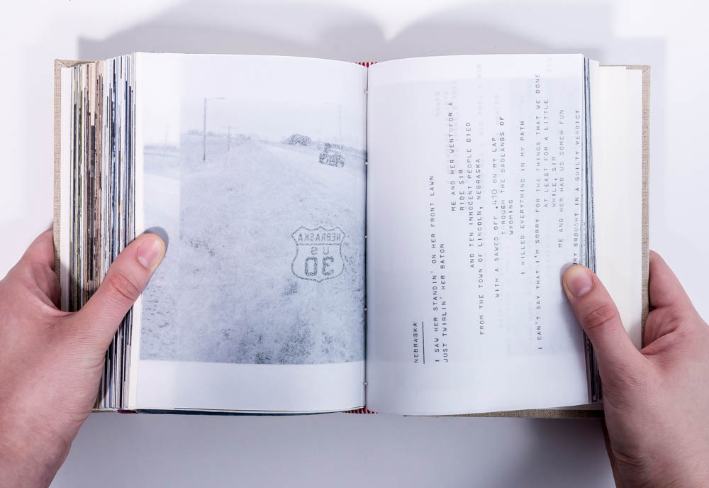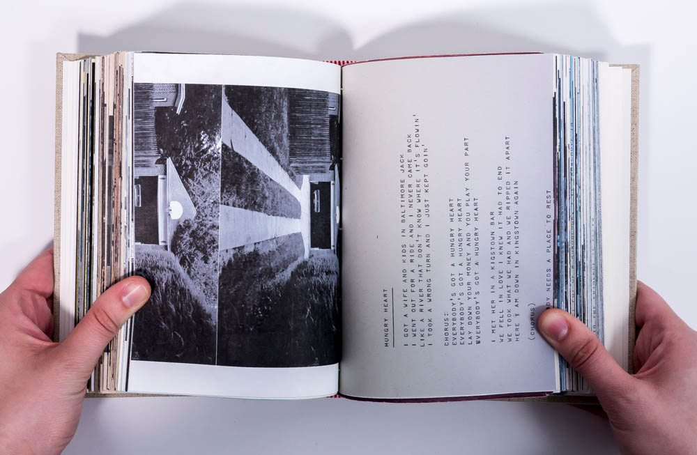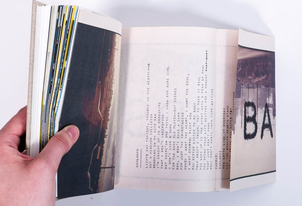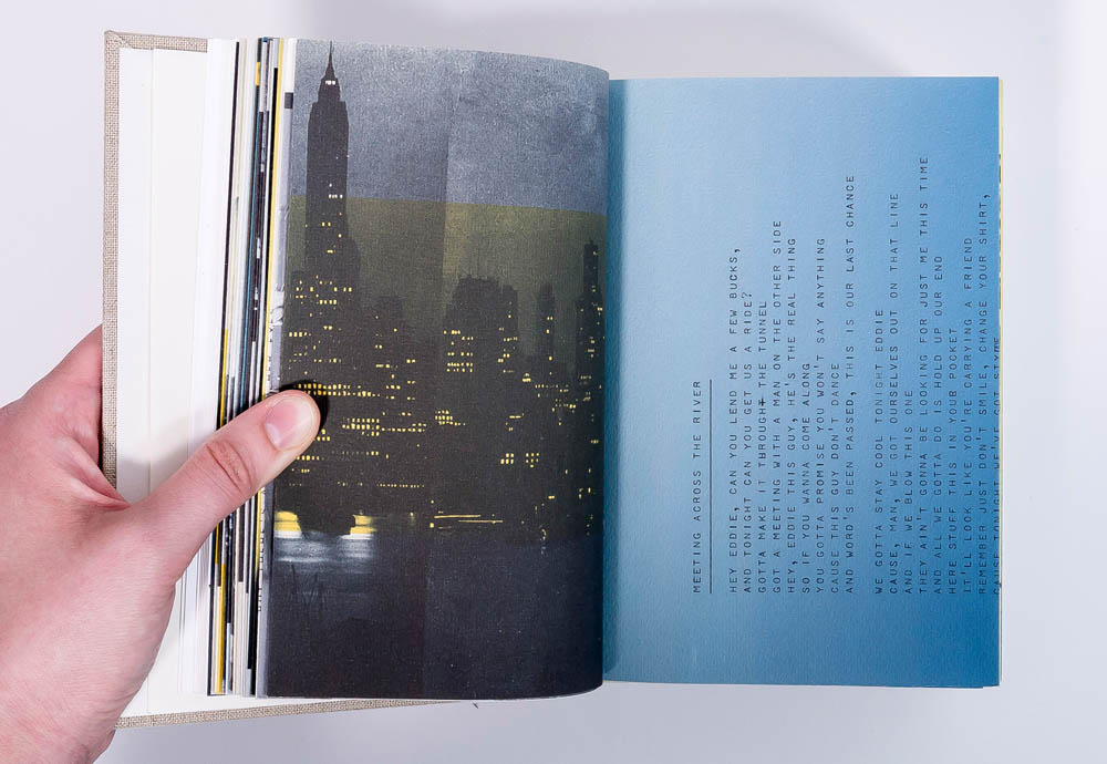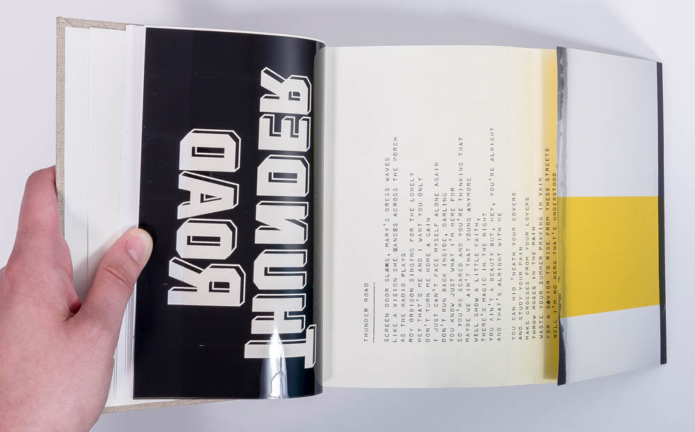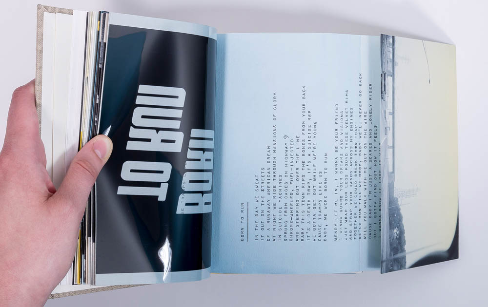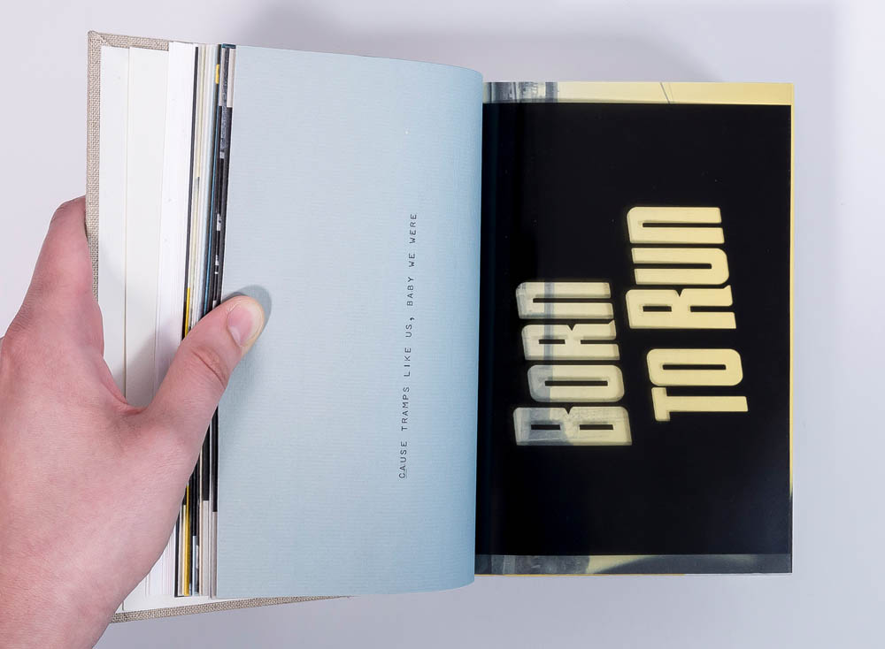 This book is a visual and emotional interpretation of the four albums Bruce Springsteen made from 1975 to 1982: Born To Run (1975), Darkness On The Edge Of Town (1978), The River (1980), and Nebraska (1982). Springsteen made each of these albums to build thematically on the previous one, carrying similar characters through emotional landscapes that reflect his own struggle to find a life worth living and his determination to give voice to those who were losing that fight. Materiality was a key part of the book’s design. The lyrics throughout the book were typed on my dad’s old typewriter, and assembled page by page which freed the layout to be more organic. The paper stock, image choice, and tone change with each album, with a key design element unique to each one.