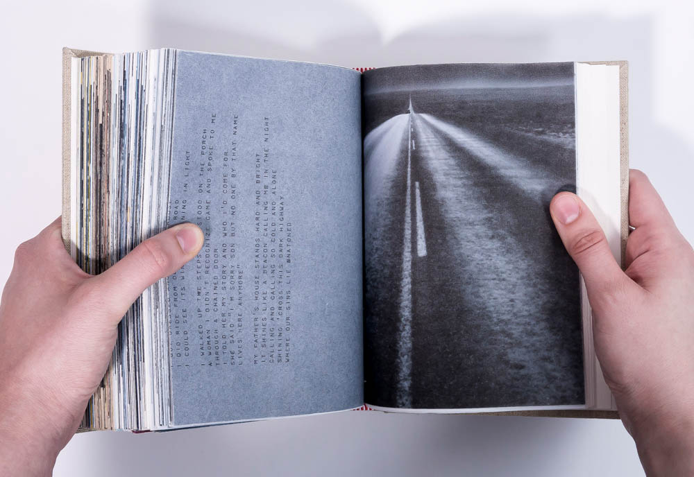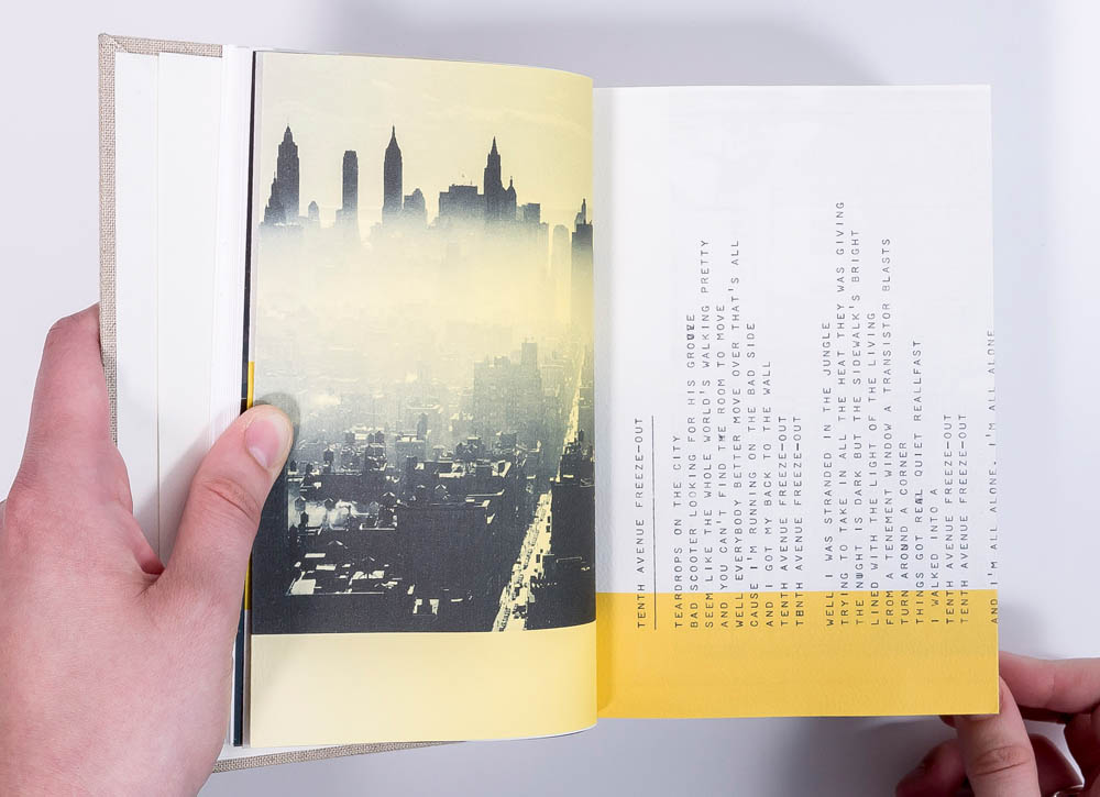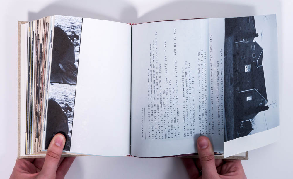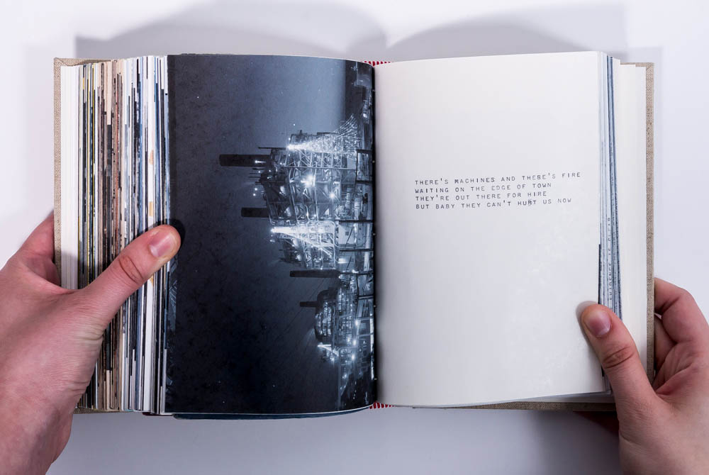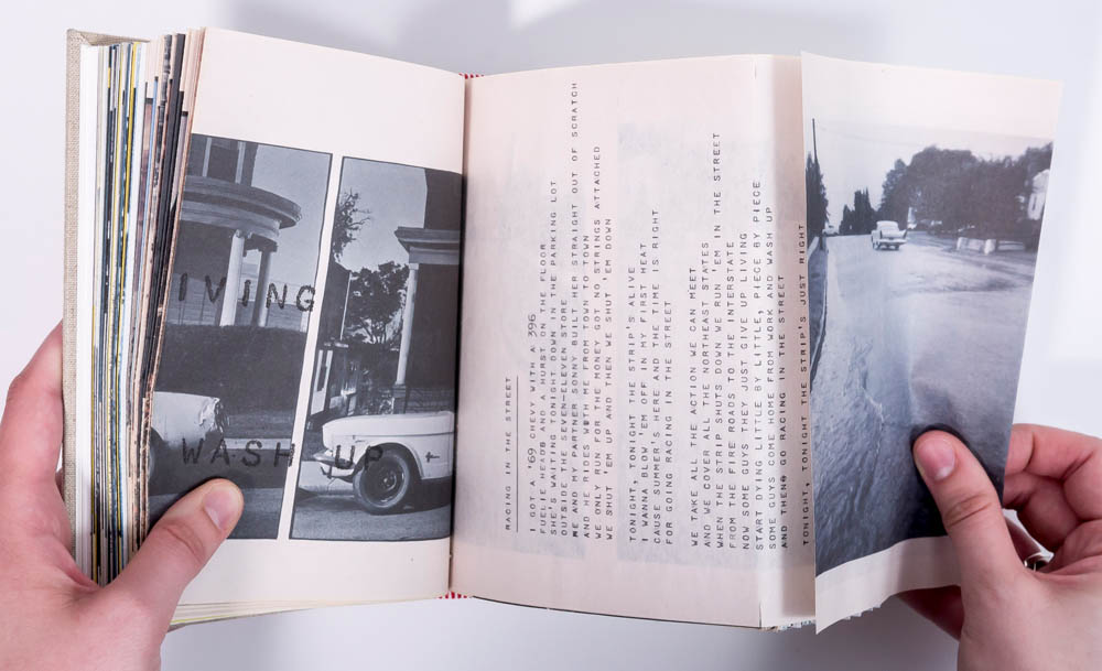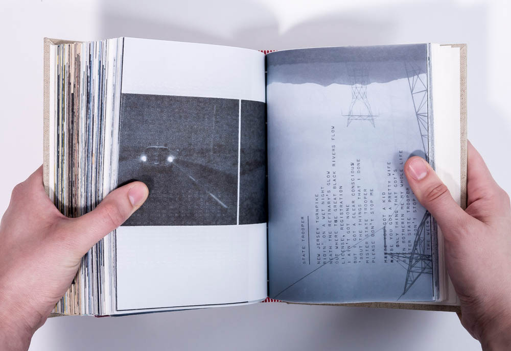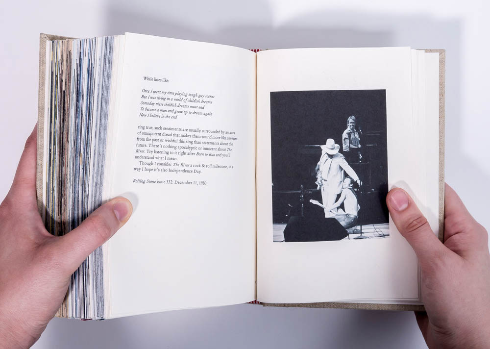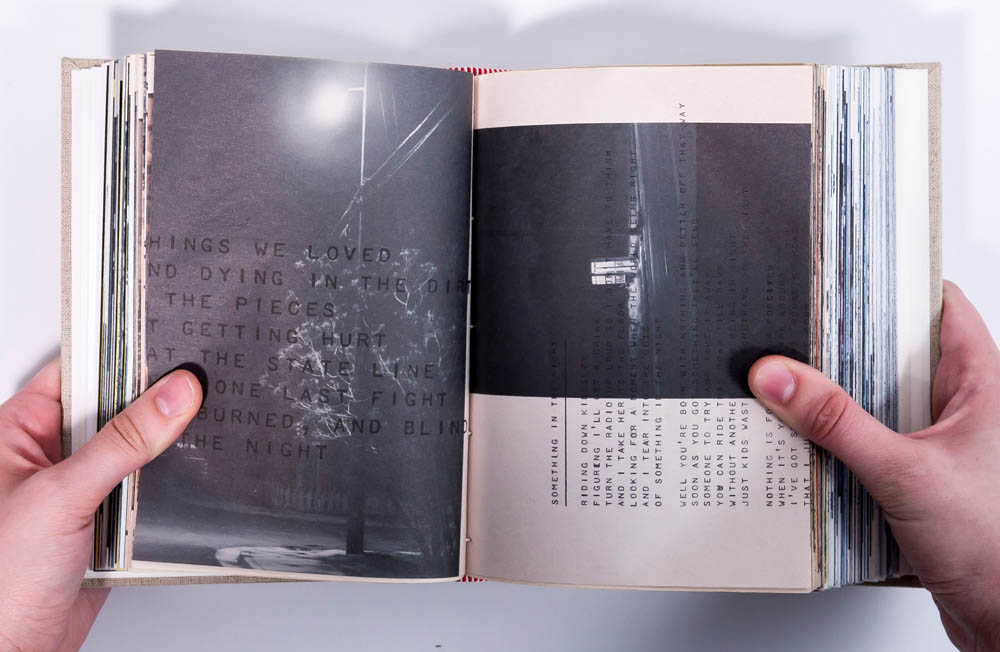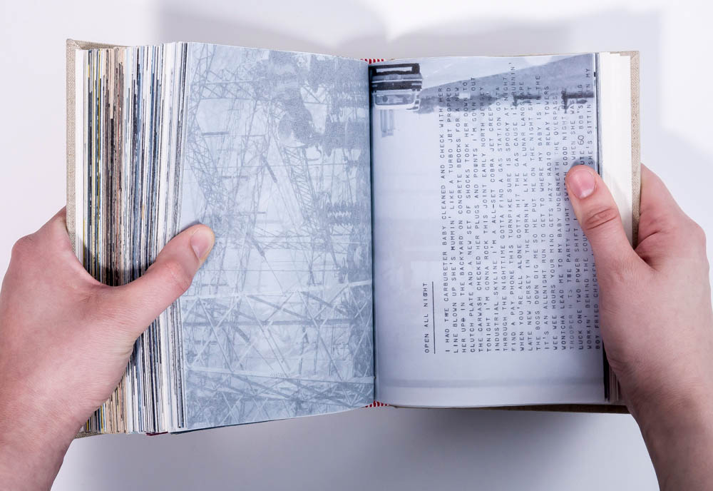 This book is a visual and emotional interpretation of the four albums Bruce Springsteen made from 1975 to 1982: Born To Run (1975), Darkness On The Edge Of Town (1978), The River (1980), and Nebraska (1982). Springsteen made each of these albums to build thematically on the previous one, carrying similar characters through emotional landscapes that reflect his own struggle to find a life worth living and his determination to give voice to those who were losing that fight. Materiality was a key part of the book’s design. The lyrics throughout the book were typed on my dad’s old typewriter, and assembled page by page which freed the layout to be more organic. The paper stock, image choice, and tone change with each album, with a key design element unique to each one.