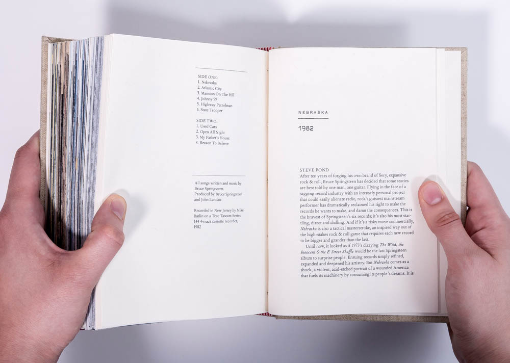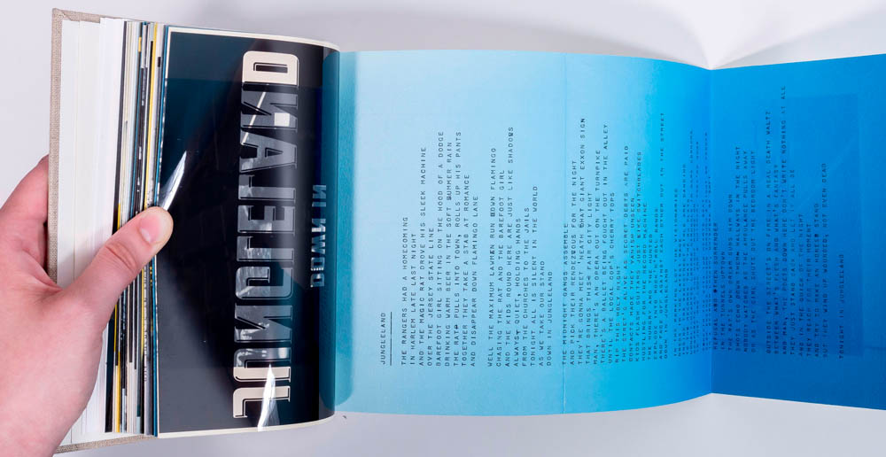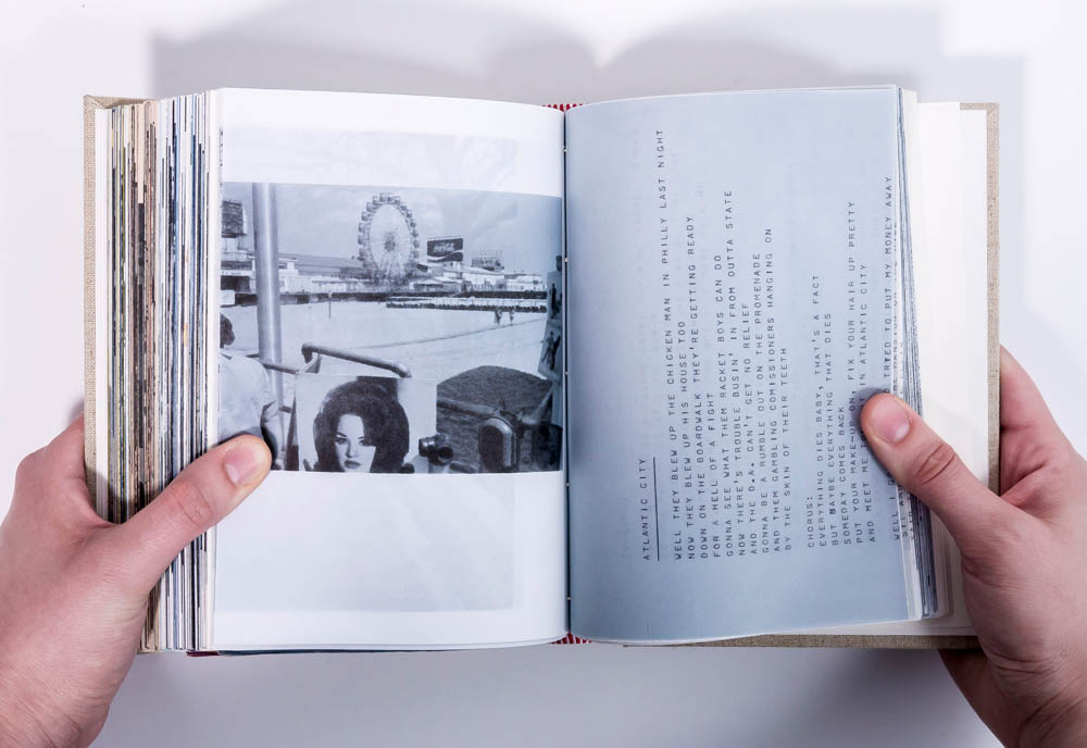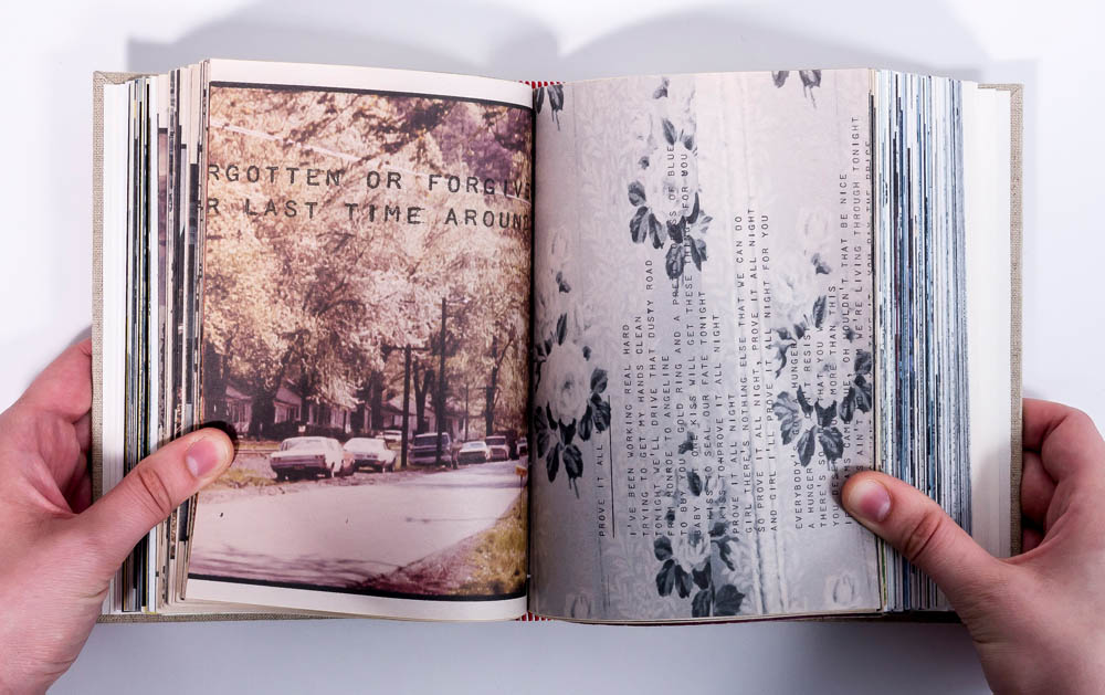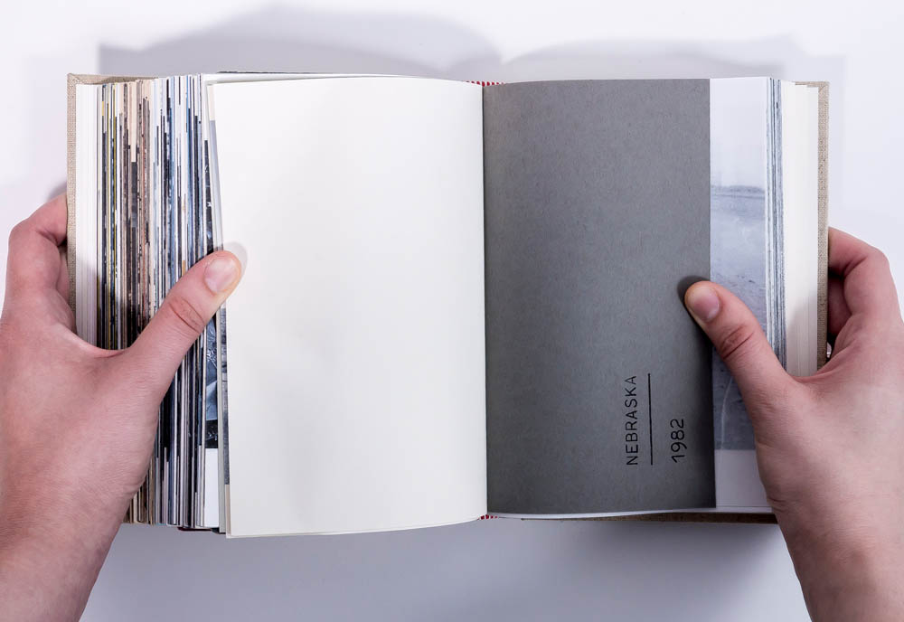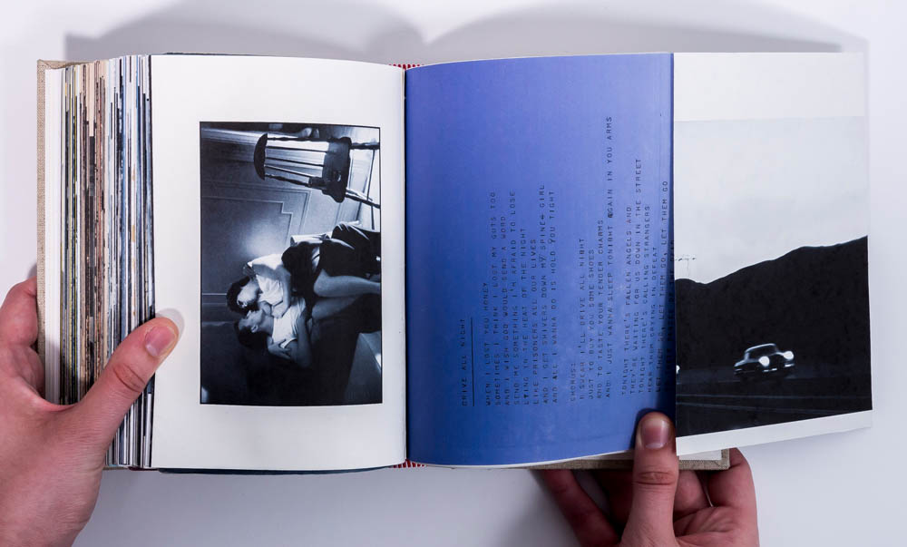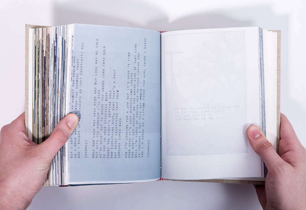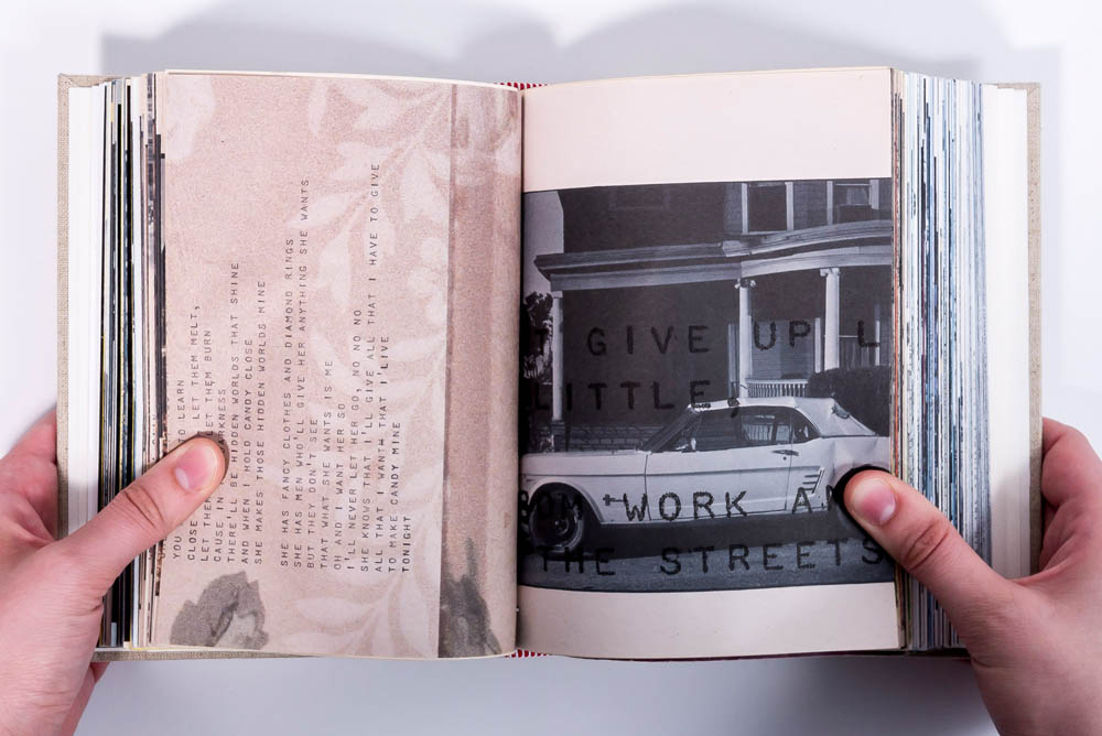 This book is a visual and emotional interpretation of the four albums Bruce Springsteen made from 1975 to 1982: Born To Run (1975), Darkness On The Edge Of Town (1978), The River (1980), and Nebraska (1982). Springsteen made each of these albums to build thematically on the previous one, carrying similar characters through emotional landscapes that reflect his own struggle to find a life worth living and his determination to give voice to those who were losing that fight. Materiality was a key part of the book’s design. The lyrics throughout the book were typed on my dad’s old typewriter, and assembled page by page which freed the layout to be more organic. The paper stock, image choice, and tone change with each album, with a key design element unique to each one.