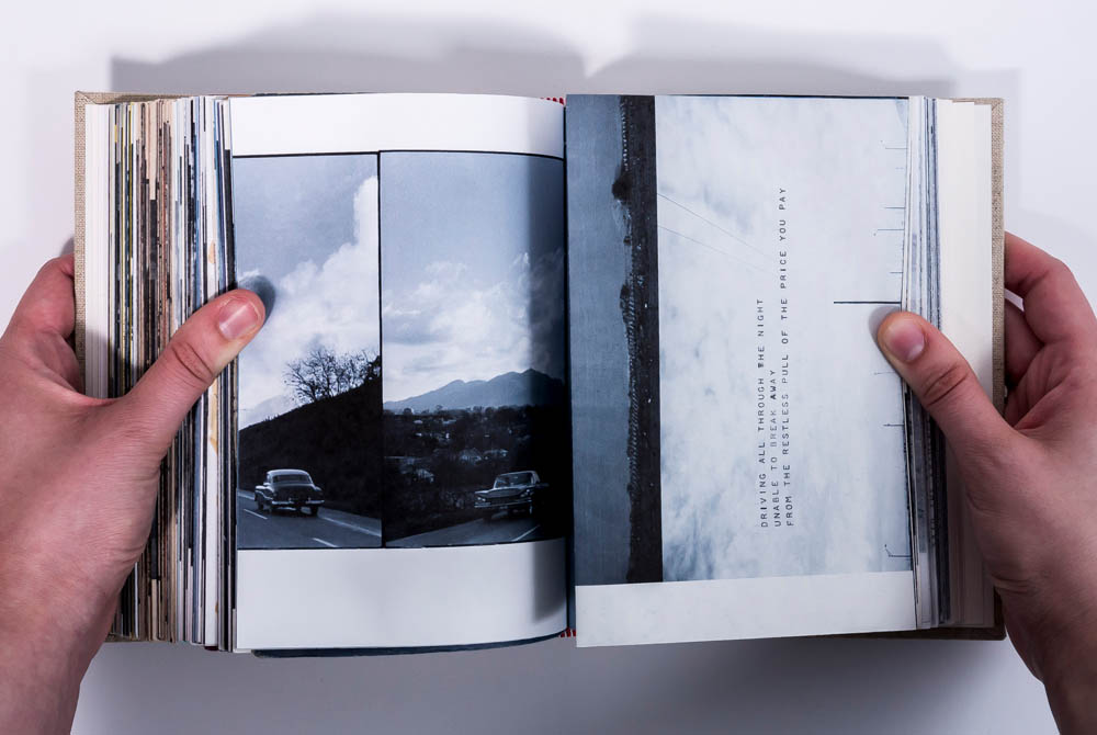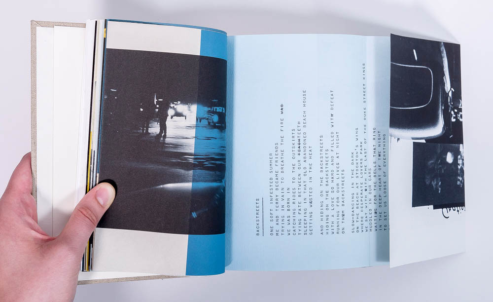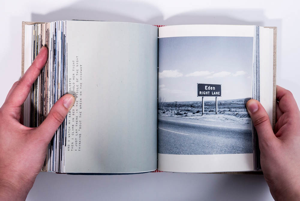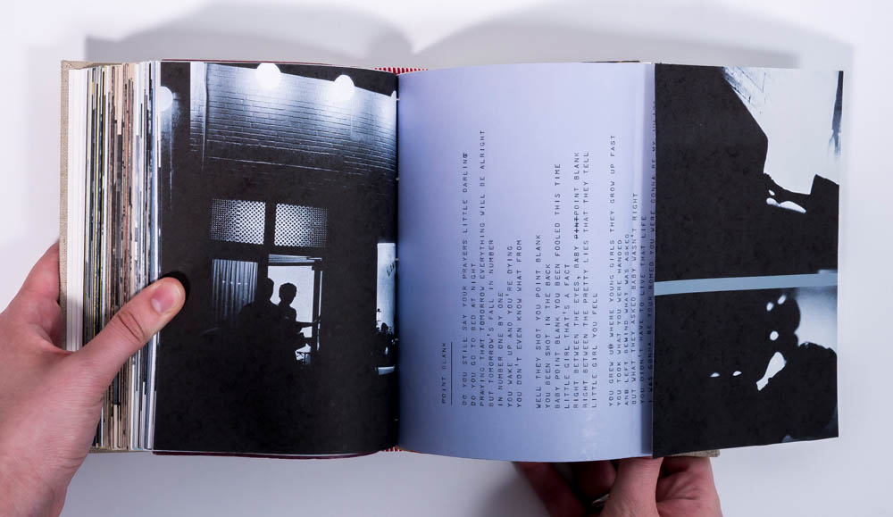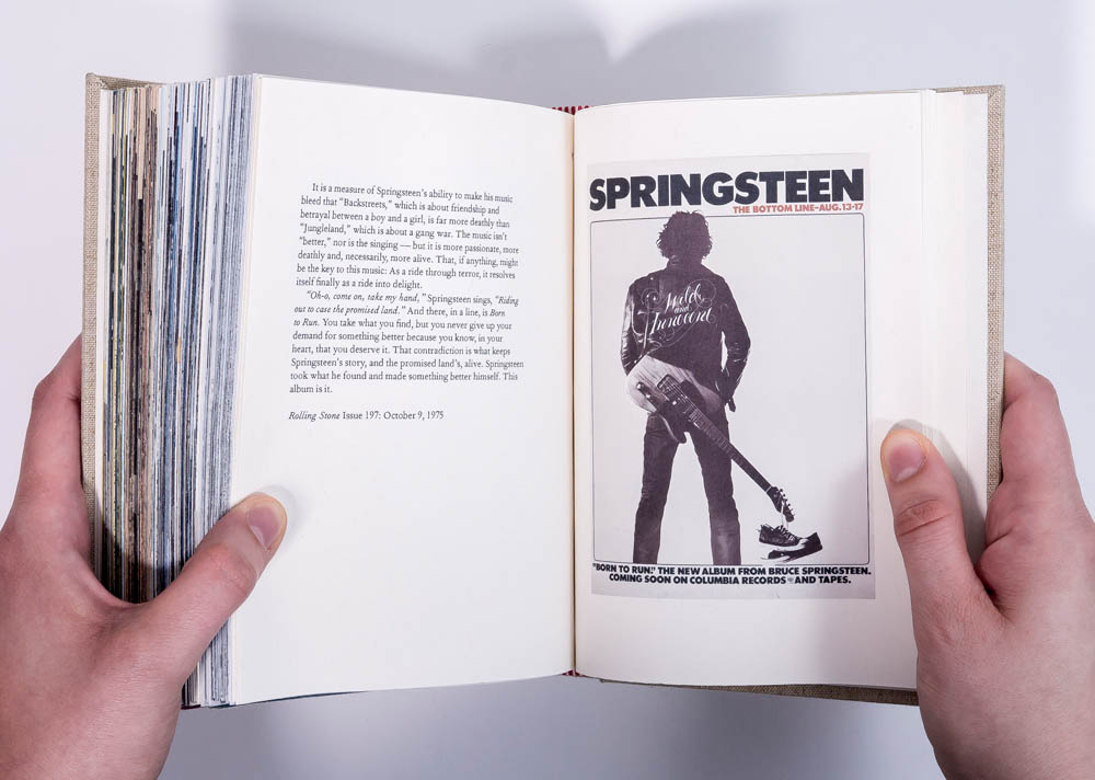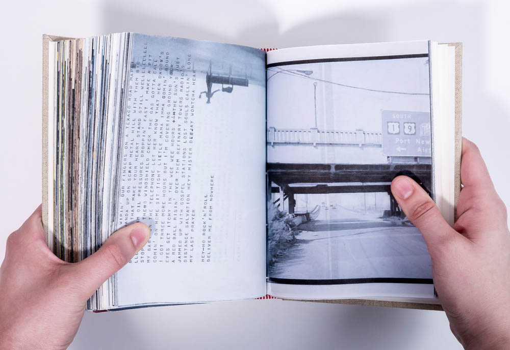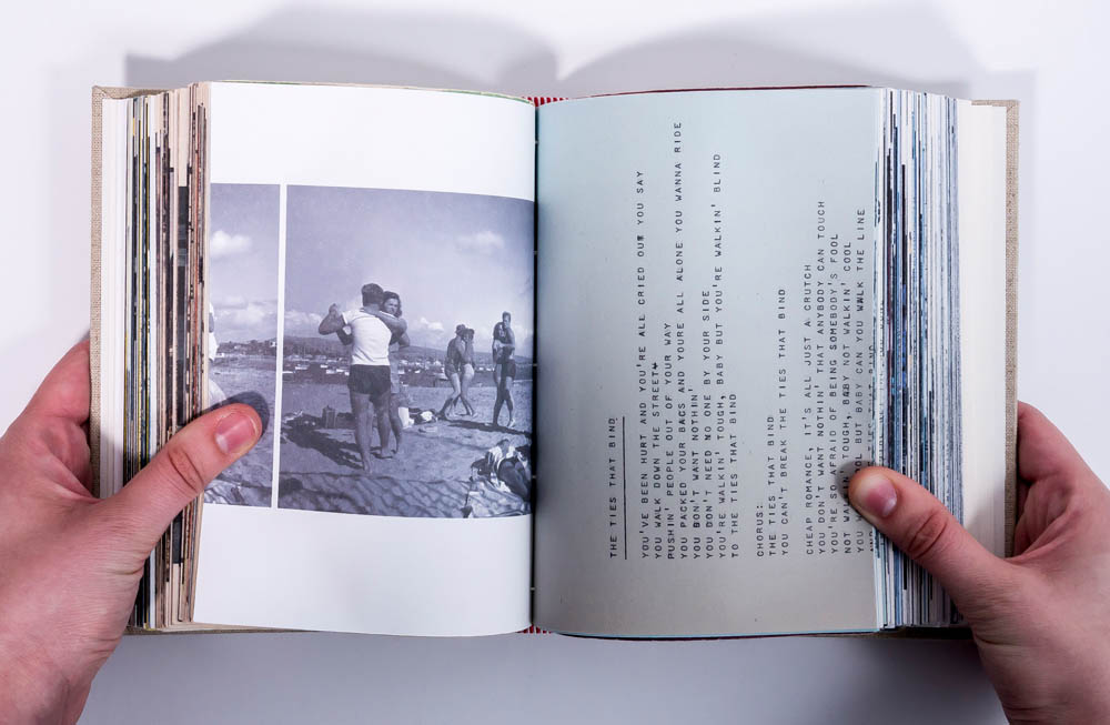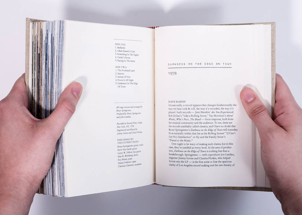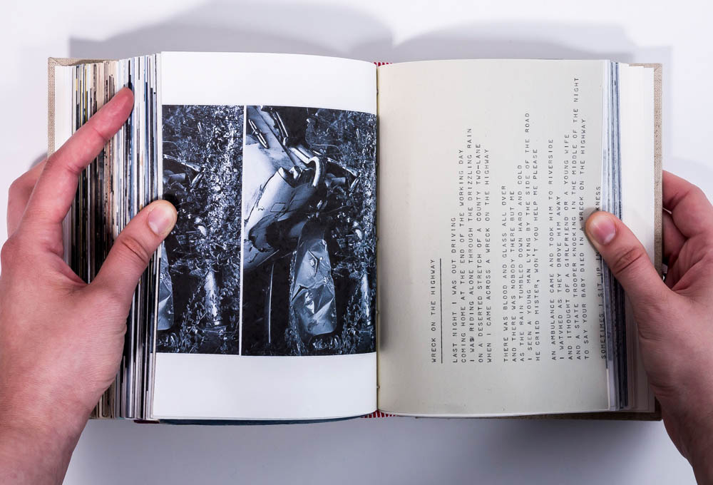 This book is a visual and emotional interpretation of the four albums Bruce Springsteen made from 1975 to 1982: Born To Run (1975), Darkness On The Edge Of Town (1978), The River (1980), and Nebraska (1982). Springsteen made each of these albums to build thematically on the previous one, carrying similar characters through emotional landscapes that reflect his own struggle to find a life worth living and his determination to give voice to those who were losing that fight. Materiality was a key part of the book’s design. The lyrics throughout the book were typed on my dad’s old typewriter, and assembled page by page which freed the layout to be more organic. The paper stock, image choice, and tone change with each album, with a key design element unique to each one.