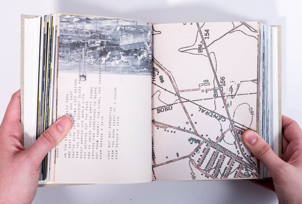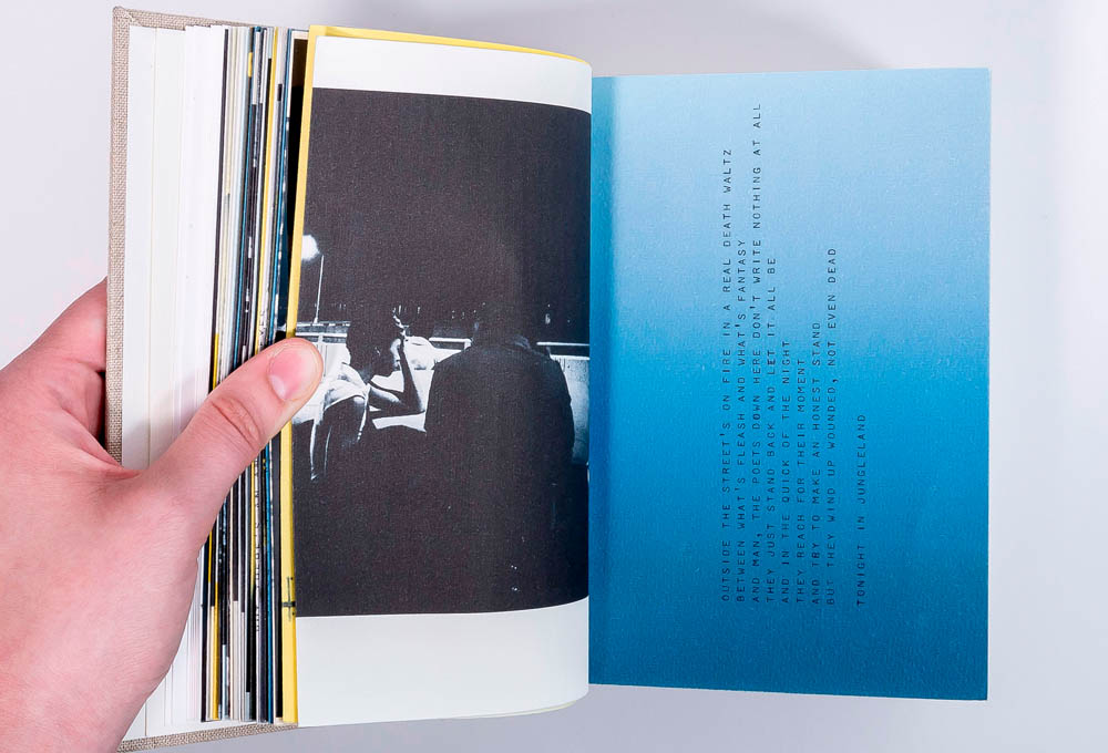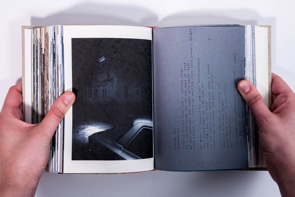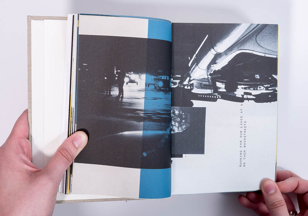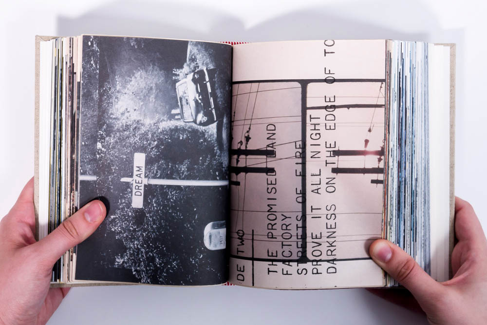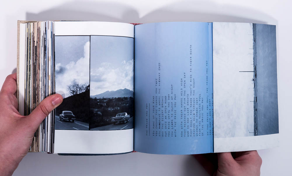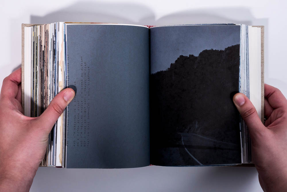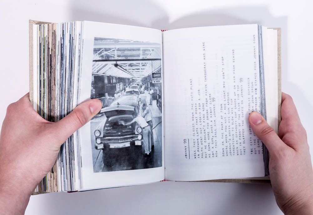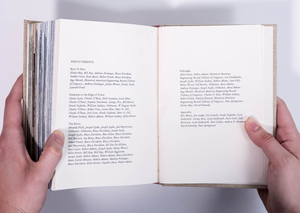 This book is a visual and emotional interpretation of the four albums Bruce Springsteen made from 1975 to 1982: Born To Run (1975), Darkness On The Edge Of Town (1978), The River (1980), and Nebraska (1982). Springsteen made each of these albums to build thematically on the previous one, carrying similar characters through emotional landscapes that reflect his own struggle to find a life worth living and his determination to give voice to those who were losing that fight. Materiality was a key part of the book’s design. The lyrics throughout the book were typed on my dad’s old typewriter, and assembled page by page which freed the layout to be more organic. The paper stock, image choice, and tone change with each album, with a key design element unique to each one.