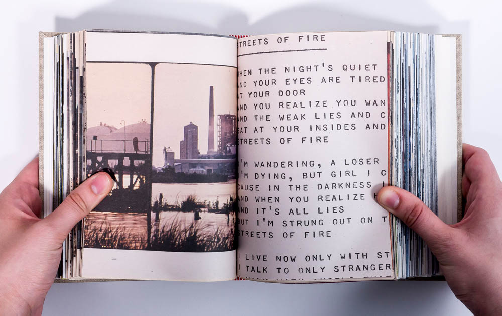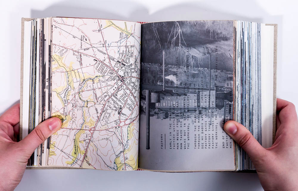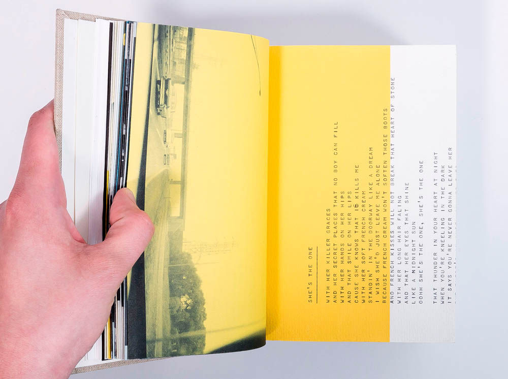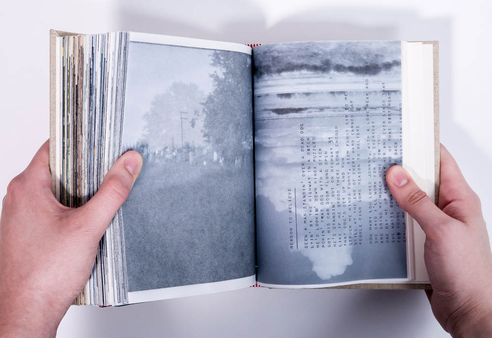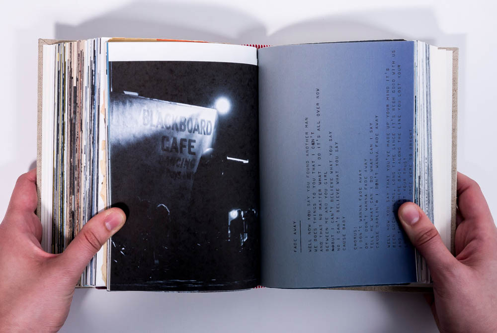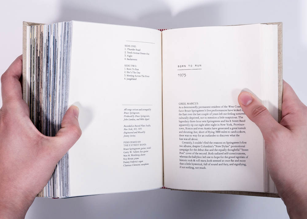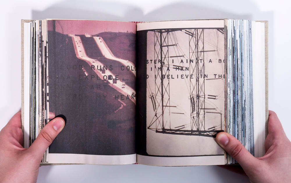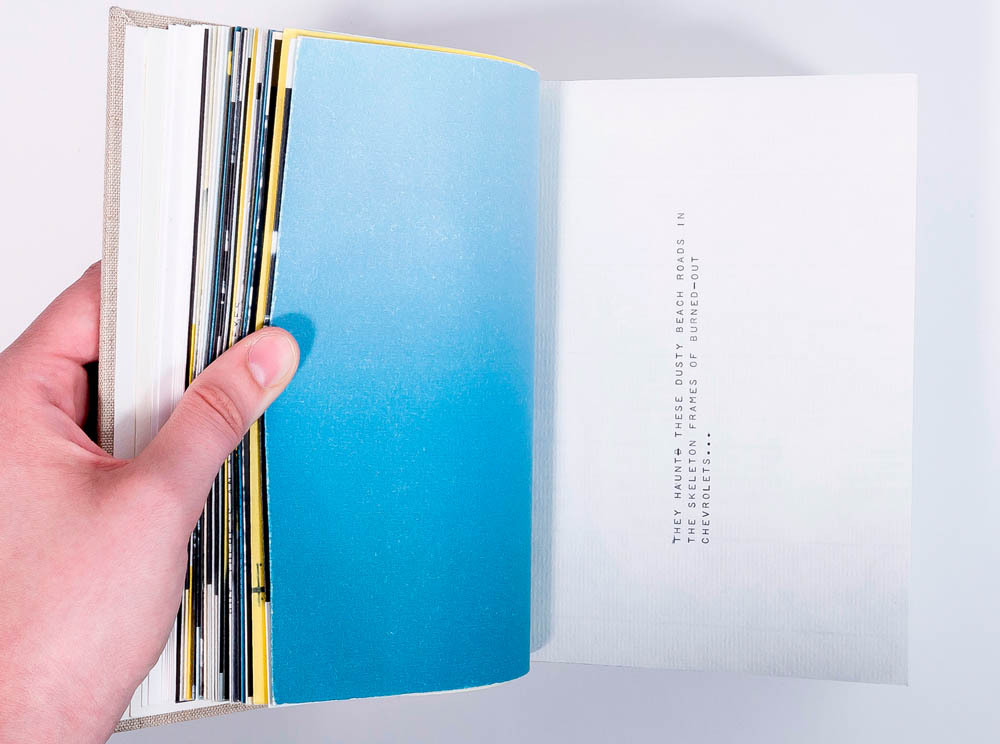 This book is a visual and emotional interpretation of the four albums Bruce Springsteen made from 1975 to 1982: Born To Run (1975), Darkness On The Edge Of Town (1978), The River (1980), and Nebraska (1982). Springsteen made each of these albums to build thematically on the previous one, carrying similar characters through emotional landscapes that reflect his own struggle to find a life worth living and his determination to give voice to those who were losing that fight. Materiality was a key part of the book’s design. The lyrics throughout the book were typed on my dad’s old typewriter, and assembled page by page which freed the layout to be more organic. The paper stock, image choice, and tone change with each album, with a key design element unique to each one.