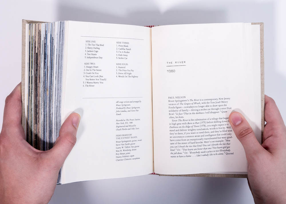 The River is a sprawling double album that focuses on relationships and the damage we do to each other when life becomes overwhelming. It is a dark and heavy album, relieved by jukebox numbers about music's power to provide a necessary escape. I used 7" record sleeves to separate the four sides of them album as a symbol of the comfort music gives the characters in the album.