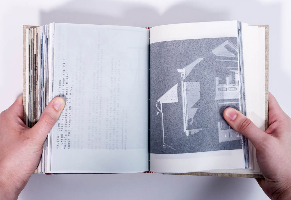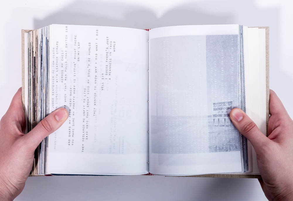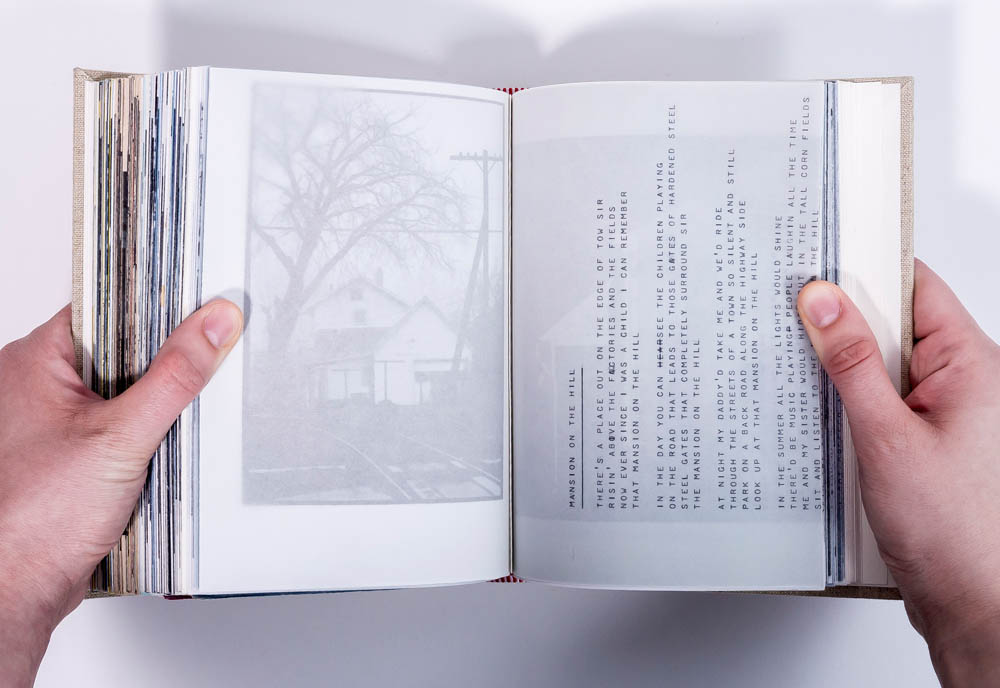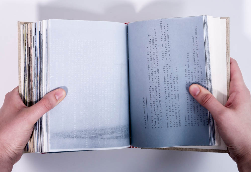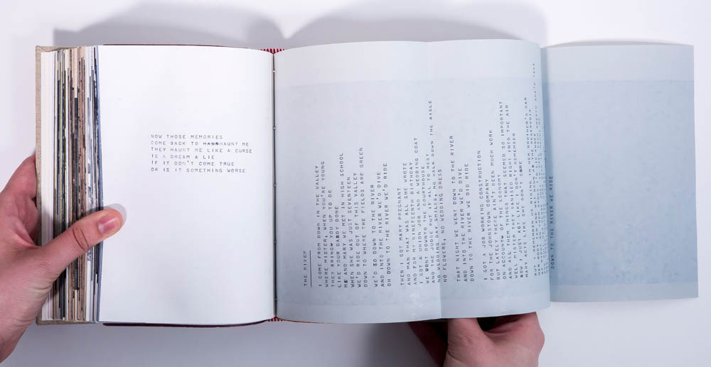 The last album, Nebraska, is Springsteen's most bleak. The songs were recorded as acoustic demos and are full of echoing space. Springsteen wrote many of the songs inspired from hazy memories of things he saw as a child and much of the album feels haunted by the souls of the characters from the previous three albums.These elements combine to make Nebraska the most unique sonically of the four. I used vellum to give layers of transparency, to evoke the sense of space the album has. Blind typing on the vellum allowed me to haunt the pages with the voices of the three previous albums as well as the lost souls who are Nebraska's focus.